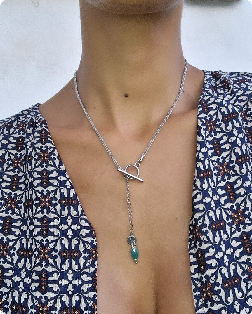 Collar hecho de acero inoxidable con colgante cristal azul y cierre de palanca.