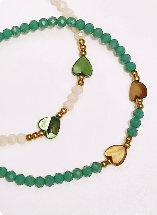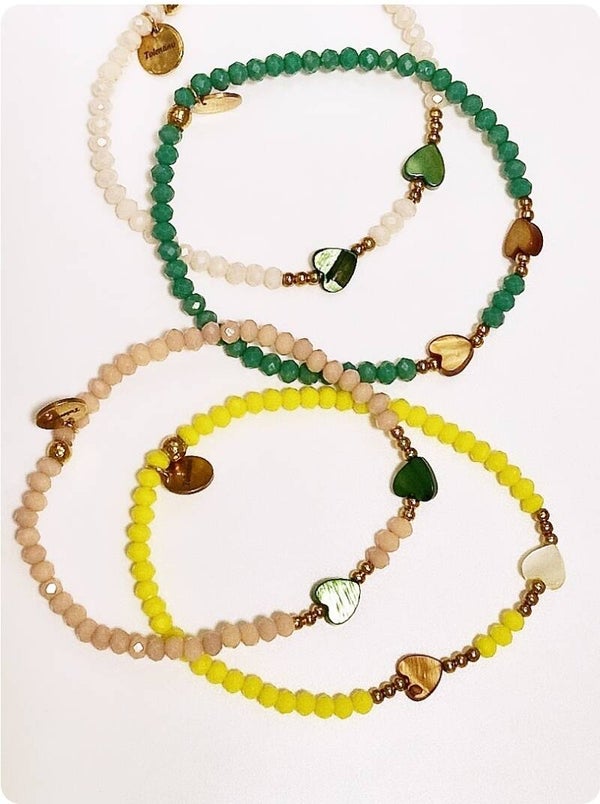 Pulseras elásticas y cómodas, hechas con cristalitos de colores, corazones de Nácar teñido y acero.