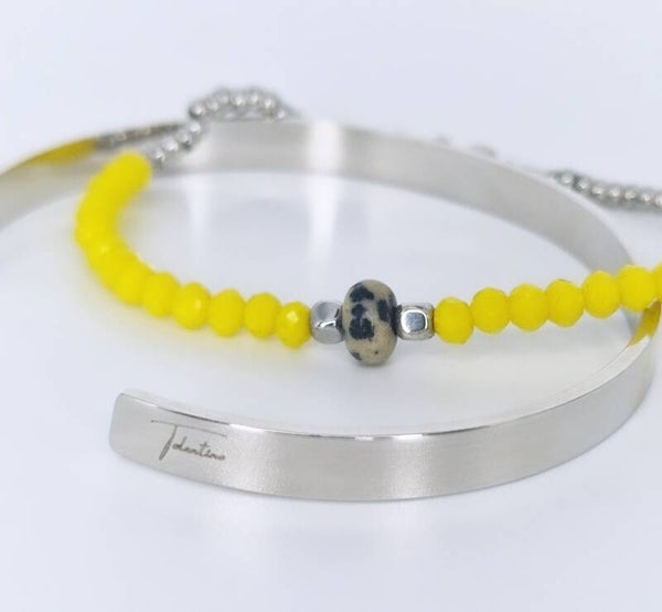 Pulsera elástica y cómoda, hechas de cristales amarillos, acero y detalle en Ojo de tigre natural.